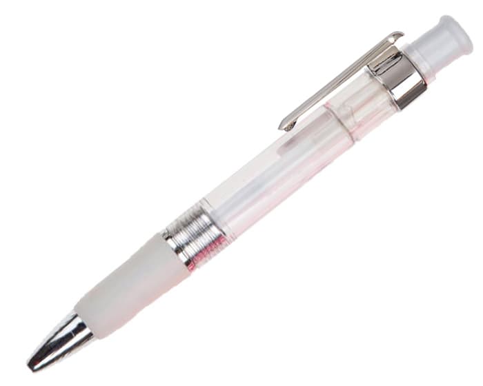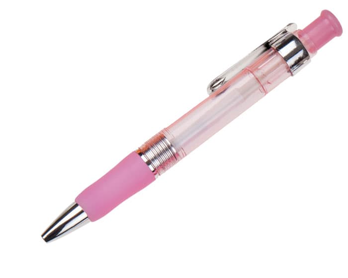 Bolígrafo de plástico traslúcido, goma antideslizante, punta cromada y mecanismo de click.
