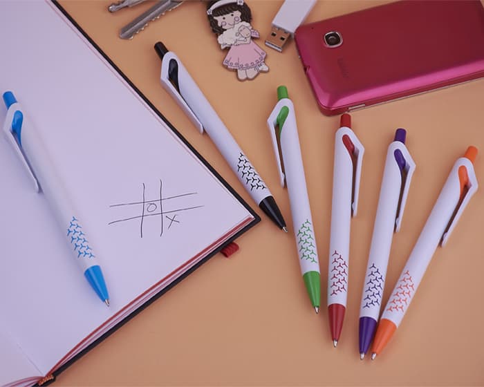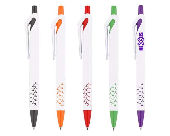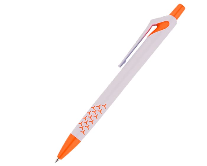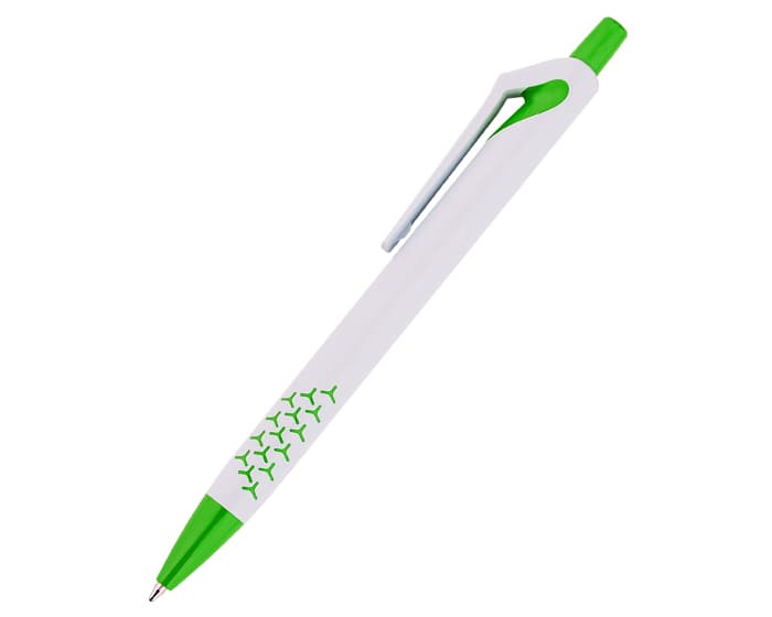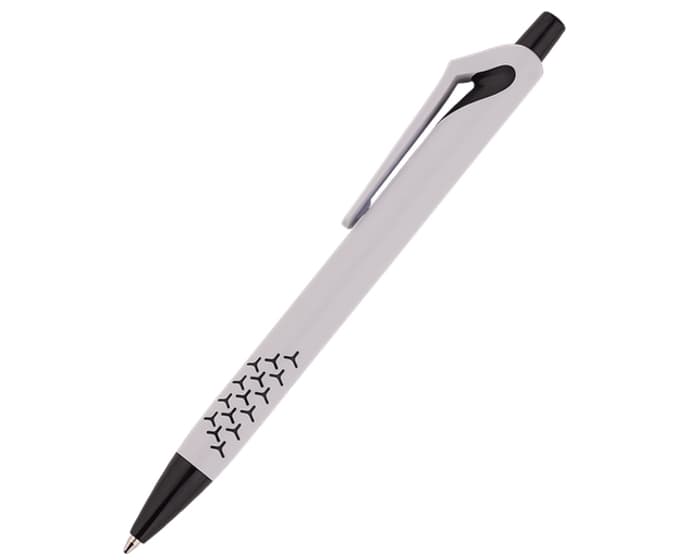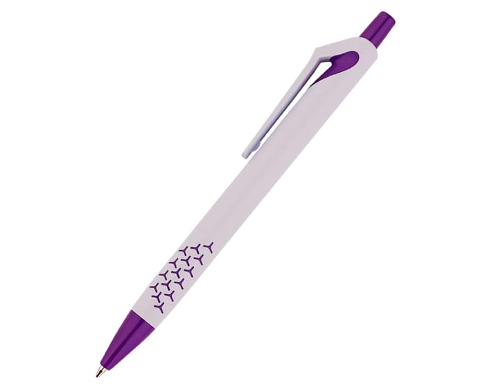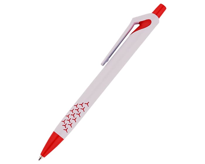 Bolígrafo plástico de cuerpo blanco y detalles en color con diseño exclusivo.Cuenta con clip plano, grabado decorativo en los costados del barril en el mismo color de la punta y el botón. Mecanismo de click.