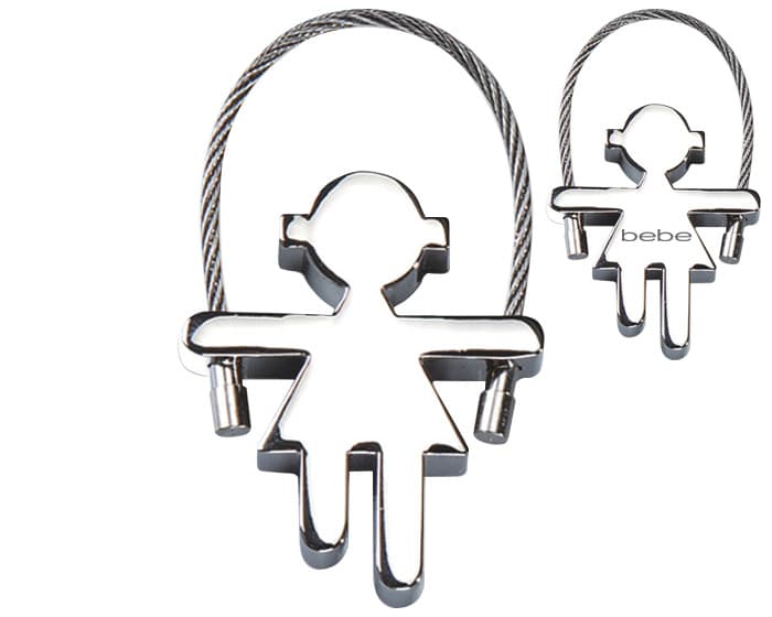 Llavero metálico, figura de niña, con cadena trenzada y perilla enroscable.