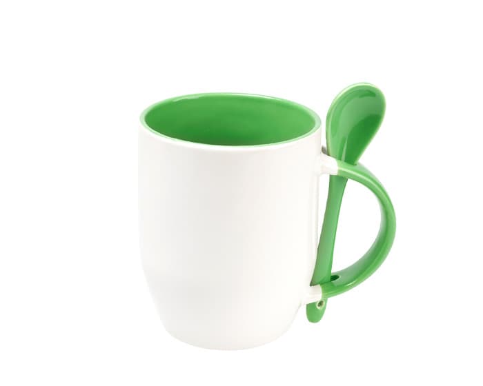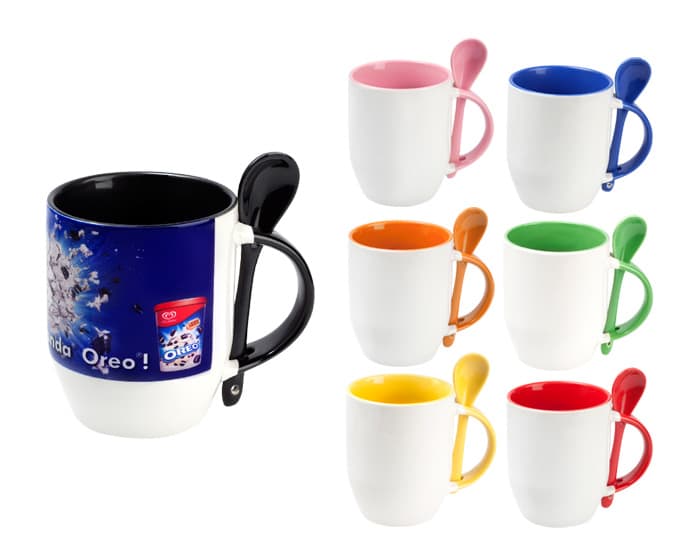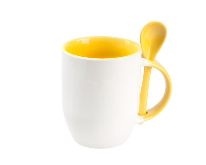 Taza de cerámica con cuchara, asa e interior en color. CAP: 12oz. INCLUYE CAJA INDIVIDUAL.